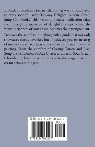 Embark on a culinary journey that brings warmth and flavor to every spoonful with "Creamy Delights: A Sour Cream Soup Cookbook." This beautifully crafted collection takes you through a spectrum of delightful soups where the versatile richness of sour cream becomes the star ingredient. Discover the art of soup-making with a guide that not only showcases classic favorites but introduces you to an array of international flavors, creative concoctions, and innovative pairings. From the comfort of Creamy Potato and Leek Soup to the boldness of Blue Cheese and Bacon Sour Cream Chowder, each recipe is a testament to the magic that sour cream brings to the pot.