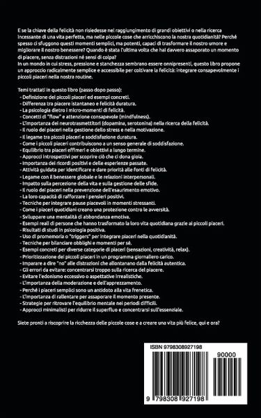 E se la chiave della felicità non risiedesse nel raggiungimento di grandi obiettivi o nella ricerca incessante di una vita perfetta, ma nelle piccole cose che arricchiscono la nostra quotidianità? Perché spesso ci sfuggono questi momenti semplici, ma potenti, capaci di trasformare il nostro umore e migliorare il nostro benessere? Quando è stata l'ultima volta che hai davvero assaporato un momento di piacere, senza distrazioni né sensi di colpa? >Temi trattati in questo libro (passo dopo passo): - Definizione dei piccoli piaceri ed esempi concreti. - Differenza tra piacere istantaneo e felicità duratura. - La psicologia dietro i micro-momenti di felicità. - Concetti di "flow" e attenzione consapevole (mindfulness). - L'importanza dei neurotrasmettitori (dopamina, serotonina) nella ricerca della felicità. - Il ruolo dei piaceri nella gestione dello stress e nella motivazione. - Il legame tra piccoli piaceri e soddisfazione duratura. - Come i piccoli piaceri contribuiscono a un senso generale di soddisfazione. - Equilibrio tra piaceri effimeri e obiettivi a lungo termine. - Approcci introspettivi per scoprire ciò che ci dona gioia. - Importanza dei ricordi positivi e delle esperienze passate. - Attività guidata per identificare e dare priorità alle fonti di felicità. - Legame con il benessere globale e le relazioni interpersonali. - Impatto sulla percezione della vita e sulla gestione delle sfide. - Il ruolo dei piaceri nella prevenzione dell'esaurimento emotivo. - La loro capacità di rafforzare i pensieri positivi. - Tecniche per integrare pause piacevoli in momenti stressanti. - Come i piaceri quotidiani creano una protezione contro le avversità. - Sviluppare una mentalità di abbondanza emotiva. - Esempi reali di persone che hanno trasformato la loro vita quotidiana grazie ai piccoli piaceri. - Risultati di studi in psicologia positiva. - Uso di promemoria o "triggers" per integrare piaceri nella quotidianità. - Tecniche per bilanciare obblighi e momenti per sé. - Esempi concreti per diverse categorie di piaceri (sensazioni, creatività, relax). - Prioritizzazione dei piccoli piaceri in un programma giornaliero carico. - Imparare a dire "no" alle distrazioni che allontanano dalla felicità autentica. - Gli errori da evitare: concentrarsi troppo sulla ricerca del piacere. - Evitare l'edonismo eccessivo o aspettative irrealistiche. - L'importanza della moderazione e dell'apprezzamento. - Perché i piaceri semplici sono un antidoto alla vita frenetica. - L'importanza di rallentare per assaporare il momento presente. - Strategie per ritrovare l'equilibrio mentale nei periodi difficili. >Siete pronti a riscoprire la ricchezza delle piccole cose e a creare una vita più felice, qui e ora?