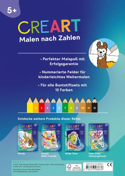 Die Ravensburger Erfolgsreihe CreArt - Malen nach Zahlen macht Malen zum Kinderspiel: Alle Ausmalfelder enthalten Zahlen, die die Farben vorgeben. Feld für Feld entstehen so ansprechende, detailreiche Bilder. Kinder malen erfolgreich auch anspruchsvolle Motive, wie Dinosaurier oder Pferde. Die Malbuch-Reihe enthält Angebote für drei Altersstufen: ab 3 Jahren, ab 5 Jahren und ab 7 Jahren. Je nach Alter variiert die Größe der Malflächen. Sehr kleine Flächen sind vorgefärbt. Die Farbe der Zahlen erleichtert Vorschulkindern die Zuordnung. So können die Kinder ganz nebenbei die Zahlen lernen. CreArt - Malen nach Zahlen gibt es auch mit Überraschungseffekt. In Heften mit Zauberpapier werden beim Ausmalen zusätzlich versteckte Details sichtbar. Das ist magisch und motiviert zum Fertigmalen. CreArt ist Malspaß mit Erfolgsgarantie und ein perfektes Geschenk für Mädchen und Jungen.