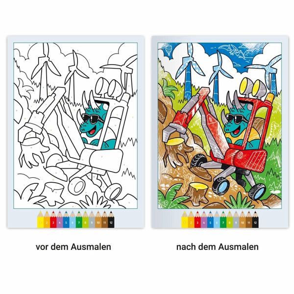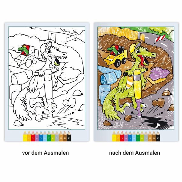 Malen nach Zahlen - jetzt auf magischem Papier! Dinosaurier, Baustellen und Fahrzeuge malen wie die Profis ist mit diesem Malbuch kein Problem.