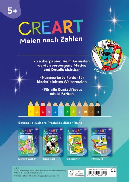 Die Ravensburger Erfolgsreihe CreArt - Malen nach Zahlen macht Malen zum Kinderspiel: Alle Ausmalfelder enthalten Zahlen, die die Farben vorgeben. Feld für Feld entstehen so ansprechende, detailreiche Bilder. Kinder malen erfolgreich auch anspruchsvolle Motive, wie Dinosaurier oder Pferde. Die Malbuch-Reihe enthält Angebote für drei Altersstufen: ab 3 Jahren, ab 5 Jahren und ab 7 Jahren. Je nach Alter variiert die Größe der Malflächen. Sehr kleine Flächen sind vorgefärbt. Die Farbe der Zahlen erleichtert Vorschulkindern die Zuordnung. So können die Kinder ganz nebenbei die Zahlen lernen. CreArt - Malen nach Zahlen gibt es auch mit Überraschungseffekt. In Heften mit Zauberpapier werden beim Ausmalen zusätzlich versteckte Details sichtbar. Das ist magisch und motiviert zum Fertigmalen. CreArt ist Malspaß mit Erfolgsgarantie und ein perfektes Geschenk für Mädchen und Jungen.