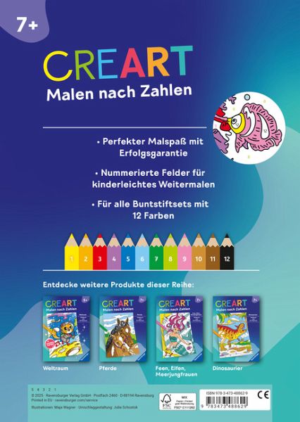 Die Ravensburger Erfolgsreihe CreArt - Malen nach Zahlen macht Malen zum Kinderspiel: Alle Ausmalfelder enthalten Zahlen, die die Farben vorgeben. Feld für Feld entstehen so ansprechende, detailreiche Bilder. Kinder malen erfolgreich auch anspruchsvolle Motive, wie Dinosaurier oder Pferde. Die Malbuch-Reihe enthält Angebote für drei Altersstufen: ab 3 Jahren, ab 5 Jahren und ab 7 Jahren. Je nach Alter variiert die Größe der Malflächen. Sehr kleine Flächen sind vorgefärbt. Die Farbe der Zahlen erleichtert Vorschulkindern die Zuordnung. So können die Kinder ganz nebenbei die Zahlen lernen. CreArt - Malen nach Zahlen gibt es auch mit Überraschungseffekt. In Heften mit Zauberpapier werden beim Ausmalen zusätzlich versteckte Details sichtbar. Das ist magisch und motiviert zum Fertigmalen. CreArt ist Malspaß mit Erfolgsgarantie und ein perfektes Geschenk für Mädchen und Jungen.