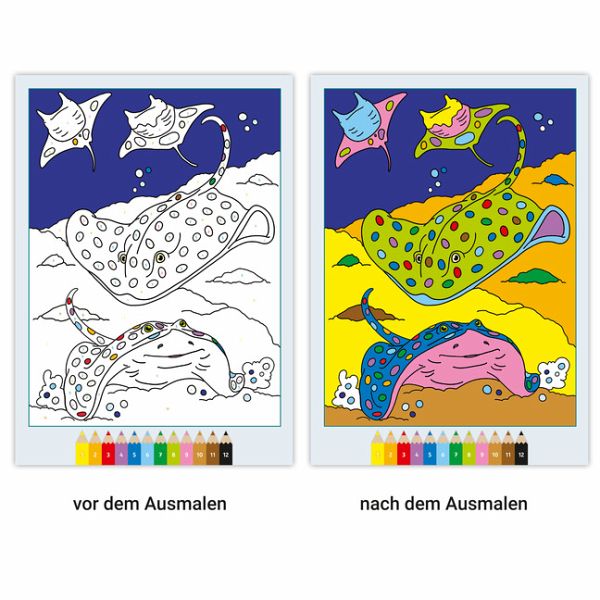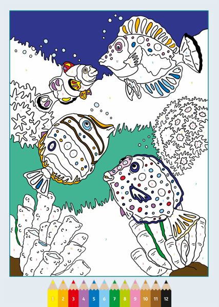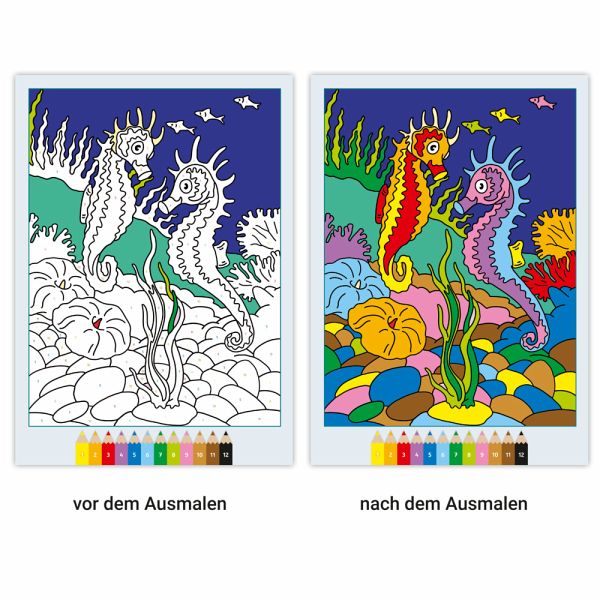 Das Malbuch enthält viele tolle Ausmalmotive rund um das Thema Meer: bunte Seepferdchen, spielende Delfine, farbenprächtige Korallenriffe und vieles mehr. Die altersgerechten Motive und nummerierten Ausmalfelder machen das Weitermalen der Bilder kinderleicht. So entstehen im Handumdrehen perfekte Kunstwerke. Die Farbpalette der Motive entspricht handelsüblichen Stiftpackungen.
