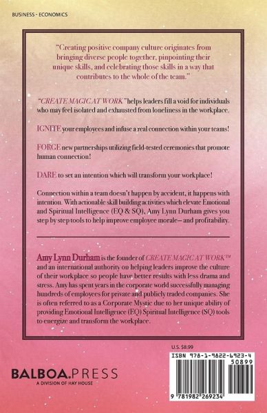 "Creating positive company culture originates from bringing diverse people together, pinpointing their unique skills, and celebrating those skills in a way that contributes to the whole of the team." "Create Magic at Work" helps leaders fill a void for individuals who may feel isolated and exhausted from loneliness in the workplace. IGNITE your employees and infuse a real connection within your teams! FORGE new partnerships utilizing field-tested ceremonies that promote human connection! DARE to set an intention which will transform your workplace! Connection within a team doesn't happen by accident, it happens with intention. With actionable skill building activities which elevate Emotional and Spiritual Intelligence (EQ & SQ), Amy Lynn Durham gives you step by step tools to help improve employee morale- and profitability.