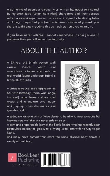 ""A gathering of poems and song lyrics written by, about or inspired by my LARP (Live Action Role Play) characters and their various adventures and experiences. From epic love poetry to stirring tales of daring, I hope that you (and whichever versions of yourself you share it with) enjoy reading this as much as I enjoyed writing it. If you have never LARPed I cannot recommend it enough, and if you have then you will know precisely why.""