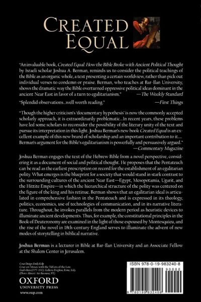 In Created Equal, Joshua Berman engages the text of the Hebrew Bible from a novel perspective, considering it as a document of social and political thought. He proposes that the Pentateuch can be read as the earliest prescription on record for the establishment of an egalitarian polity. What emerges is the blueprint for a society that would stand in stark contrast to the surrounding cultures of the ancient Near East -- Egypt, Mesopotamia, Ugarit, and the Hittite Empire - in which the hierarchical structure of the polity was centered on the figure of the king and his retinue. Berman shows that an egalitarian ideal is articulated in comprehensive fashion in the Pentateuch and is expressed in its theology, politics, economics, use of technologies of communication, and in its narrative literature. Throughout, he invokes parallels from the modern period as heuristic devices to illuminate ancient developments. Thus, for example, the constitutional principles in the Book of Deuteronomy are examined in the light of those espoused by Montesquieu, and the rise of the novel in 18th-century England serves to illuminate the advent of new modes of storytelling in biblical narrative.