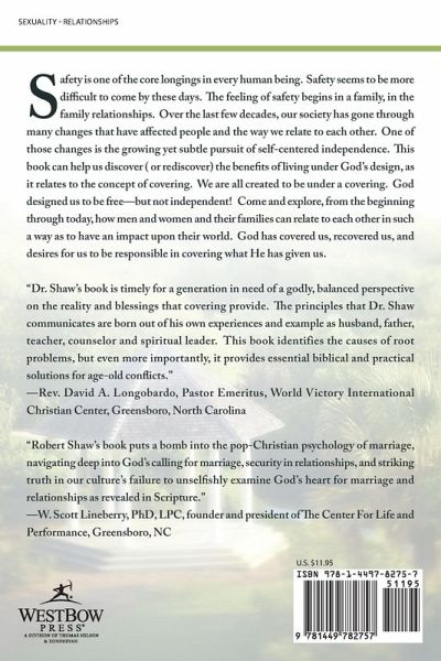 Safety is one of the core longings in every human being. Safety seems to be more difficult to come by these days. The feeling of safety begins in a family, in the family relationships. Over the last few decades, our society has gone through many changes that have affected people and the way we relate to each other. One of those changes is the growing yet subtle pursuit of self-centered independence. This book can help us discover ( or rediscover) the benefits of living under God's design, as it relates to the concept of covering. We are all created to be under a covering. God designed us to be free-but not independent! Come and explore, from the beginning through today, how men and women and their families can relate to each other in such a way as to have an impact upon their world. God has covered us, recovered us, and desires for us to be responsible in covering what He has given us. "Dr. Shaw's book is timely for a generation in need of a godly, balanced perspective on the reality and blessings that covering provide. The principles that Dr. Shaw communicates are born out of his own experiences and example as husband, father, teacher, counselor and spiritual leader. This book identifies the causes of root problems, but even more importantly, it provides essential biblical and practical solutions for age-old conflicts." -Rev. David A. Longobardo, Pastor Emeritus, World Victory International Christian Center, Greensboro, North Carolina "Robert Shaw's book puts a bomb into the pop-Christian psychology of marriage, navigating deep into God's calling for marriage, security in relationships, and striking truth in our culture's failure to unselfishly examine God's heart for marriage and relationships as revealed in Scripture." -W. Scott Lineberry, PhD, LPC, founder and president of The Center For Life and Performance, Greensboro, NC
