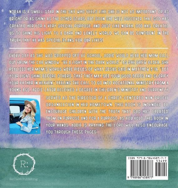 Norah is a small star in the sky who feels like she is not as important or as bright or as shiny as the other stars. But soon she will discover that God has created her for a very special purpose. And just like Norah, God has created us to shine His light to a dark and lonely world. We can be confident in the truth that He has special plans for our lives! ¿Every day as she was dropped off at school, Addie would hear her mom call out from the car window, "Be a light in the dark world." As she grew older, she realized her mom's words were pieces of what Jesus said in Matthew 5:16, "Let your light shine before others, that they may see your good deeds and glorify your Father in heaven." Feeling the call to go into vocational ministry from a young age, Addie later received a degree in children's ministry and currently serves as the director of a Christ-centered non-profit organization in her hometown. This book is intended to encourage children with the truth that God has created them on purpose and for a purpose. As you hold this book in your hands, Addie is praying the Lord will also encourage you through these pages.