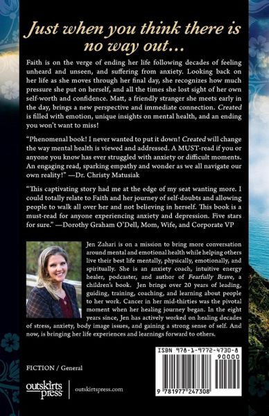 Faith is on the verge of ending her life following decades of feeling unheard and unseen, and suffering from anxiety. Looking back on her life as she moves through her final day, she recognizes how much pressure she put on herself, and all the times she lost sight of her own self-worth and confidence. Matt, a friendly stranger she meets early in the day, brings a new perspective and immediate connection. Created is filled with emotion, unique insights on mental health, and an ending you won't want to miss! "Phenomenal book! I never wanted to put it down! Created will change the way mental health is viewed and addressed. A MUST-read if you or anyone you know has ever struggled with anxiety or difficult moments. An engaging read, sparking empathy and wonder as we all navigate our own reality!" -Dr. Christy Matusiak "This captivating story had me at the edge of my seat wanting more. I could totally relate to Faith and her journey of self-doubts and allowing people to walk all over her and not believing in herself. This book is a must-read for anyone experiencing anxiety and depression. Five stars for sure." -Dorothy Graham O'Dell, Mom, Wife, and Corporate VP Mental health/trigger warning This book includes thoughts about suicide, anxiety, depression, and other hard life moments. If you struggle with any of these, it may be hard to read some aspects. Your health and safety is my number one concern. I wrote the contents of this fiction story to help others understand what happens in the mind of someone struggling with these and other self-defeating topics. Book one lays the groundwork. Book two will bring many concepts of how to overcome to life. The book's content is not meant to replace any type of psychological, physical, or mental health care. If you or someone you know is struggling, please get support from a qualified practitioner. If you or someone you know is struggling with suicidal thoughts, please contact the prevention line at 988. ¿Stay well, Jen