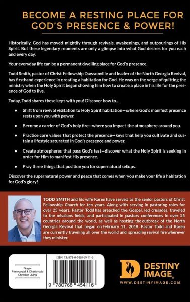 Become a Resting Place for God's Presence and Power! Historically, God has moved mightily through revivals, awakenings, and outpourings of His Spirit. But these legendary moments are only a glimpse into what God desires for you each and every day. Your everyday life can be a permanent dwelling place for God's presence. Todd Smith, pastor of Christ Fellowship Dawsonville and leader of the North Georgia Revival, has first hand experience in creating a habitation for God. He was on the verge of quitting the ministry when the Holy Spirit began showing him how to create a place in his life for the Presence of God to live. Today, Todd shares these keys with you! Discover how to... Shift from revival visitation to Holy Spirit habitation-where God's manifest Presence rests upon you with power. Become a carrier of God's holy fire-where you impact the atmosphere around you. Practice core values that protect the Presence-keys that help you cultivate and sustain a lifestyle saturated in God's presence and power. Create atmospheres that pass God's test-discover what the Holy Spirit is seeking in order for Him to manifest His Presence. Pray three things that position you for supernatural set-ups. Discover the supernatural power and peace that comes when you make your life a habitation for God's glory!