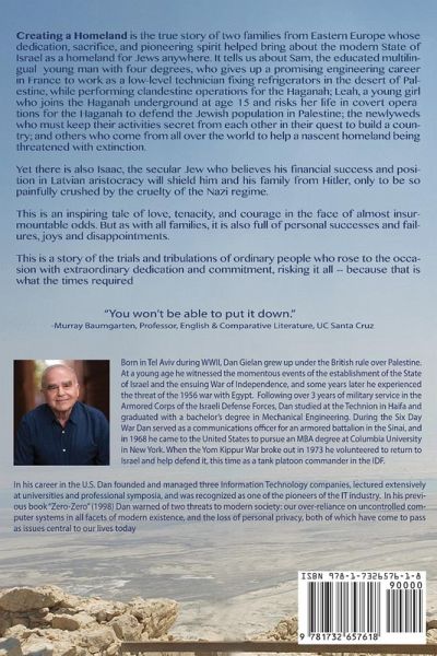 Creating a Homeland is the true story of two families from Eastern Europe whose dedication, sacrifice, and pioneering spirit helped bring about the modern State of Israel as a homeland for Jews anywhere: Sam, the young man with two engineering degrees who speaks seven languages who gives up a promising engineering career in France to work as a technician fixing refrigerators in the desert of Palestine; Leah, the young girl who joins the Haganah underground at age 15 and risks her life to defend the nation; the newlyweds, who must keep their their activities secret from each other in their quest to build a country; and others who come from all over the world to help a nascent nation being threatened with extinction. But there is also Isaac, the secular Jew who believes his financial success and position in Latvian aristocracy will shield him and his family from Hitler, only to be so painfully crushed by the cruelty of the Nazi regime. This is an inspiring tale of love, tenacity, and courage in the face of almost insurmountable odds. But as with all families, it is also full of personal successes and failures, joys and disappointments. This is a story of ordinary people who rose to the occasion with extraordinary dedication and commitment, risking it all -- because that is what the times required.
