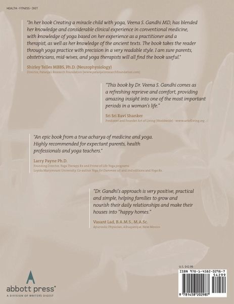 Exposed to yoga from early childhood, Veena S. Gandhi, M.D has been conducting yoga classes and organizing seminars on yoga and its philosophy for over two decades. A board-certified OB/GYN, Dr. Gandhi has over 40 years of experience in working with pregnant women and in delivering babies. Her knowledge of yoga and medical training from the Eastern and Western hemispheres gives her a unique perspective in helping couples create a miracle child. For her dedication and generosity, Dr. Gandhi has received many awards, including "Best Doctor" from the Courier-Post newspaper, Woman of Outstanding Achievement by the Camden County Council of Girl Scouts, and the Bhakti Visharat award for dedicated service to the community by the International Society of Krishna Consciousness. Additionally, the American Association of Physicians of Indian Origin (AAPI) awarded her the presidential award and women's leadership award for her dedicated service to AAPI. She ran several youth programs for human values and culture. Recently she has accepted a leading position in AAPI in improving women's health. She introduced and taught yoga at every AAPI annual convention since 1995. Her latest community effort involves increasing the literacy of children in India's remote villages as a member of the Board of Directors of the Ekal Vidyalaya Foundation for the last twelve years. She was recognized for her outstanding and dedicated service to "The literacy movement" in India. Dr. Gandhi lives in Voorhees, New Jersey with her husband, Sharad K. Gandhi. She has two grown children and two grandchildren. This is her first book.