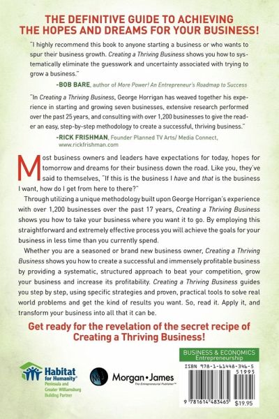 Most business owners and leaders have expectations for today, hopes for tomorrow and dreams for down the road for their business. They say to themselves, if this is the business I have and that is the business I want, how do I get from here to there? By using a systematic, structured methodology build upon George Horrigan's experience with over 1,200 businesses over the past 17 years, Creating a Thriving Business shows business owners, leaders, and managers how to solve real world problems and get the kind of results they want. By using a proven, practical, and comprehensive methodology that is simple to understand, straightforward, easy to implement, and extremely effective, the reader will be able to achieve the goals for their business in less hours than they are currently spending on their business, thereby turning today’s problems into tomorrow’s promise. Creating a Thriving Business shows the reader, step by step how to create a successful, thriving, and immensely profitable business by providing an approach that enables them to eliminate the guesswork, trial and error, and uncertainty associated with trying to beat their competition, grow their business and increase its profitability.