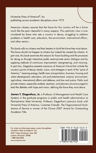 American citizens assume that the future for this country will be a future much like the past-beautiful in many respects. This optimistic view is now countered by those who see a country in decay, struggling to address problems in health care, education, the environment, international affairs, and other sectors. This book calls on citizens and their leaders to build the future they most desire. The future should not happen to citizens but instead be created by citizens. In part one, this book examines the reasons for future building and the processes for doing so through interactive public sector-private sector dialogue and by applying methods of continuous improvement, reengineering, and visioning. In part two, Ziegenfuss presents scenarios of America's future that include the country's points of decay, trends, vision, and strategies in each of the "parts of America," meaning energy, health care, transportation, business, housing and urban development, education, arts and entertainment, science, environment, agriculture, international affairs and defense, and law and justice. Public and private citizens, especially students, teachers, and planners are encouraged to lead the debates with hope and vision, defining the future they most desire.