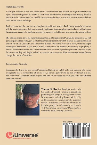 Creating Cassandra is two love stories about the same man and woman set eight hundred years apart. The story begins in the 1990s as the Boston based author is seeking and ultimately finds his model for the Cassandra of his twelfth-century novella about a man and woman who will share their names in that other age. Both his muse and the character she inspires are ambitious women. Both marry powerful men who will die leaving them and their not necessarily legitimate fortunes vulnerable. And each will call upon her century?s version of a knight, mercenary or gangster to hold on to what otherwise would be lost. The obsessions that drive the superstitious author and his determined Cassandra influence what will come to pass in the novella, just as what the author ascribes to his twelfth-century characters influences the actions of his Cassandra and the author himself. When the two worlds meet, there are ample warnings of danger but as you would expect in the case of a Cassandra, no warning or prophesy is heeded. Neither the author nor Cassandra would ever have anticipated the price that they had to pay for the worlds they had fought so hard to create in either century. What they created would forever change the course of their lives. From Creating Cassandra Giangreco slowly put his arm around Cassandra. He held her tightly as he said ?Anyone who writes a biography that is supposed to tell all is a fool, a liar or a person who has not lived much of a life. You know that, Cassandra. Think of your own life. And I would not want you to be any different than how you are.?