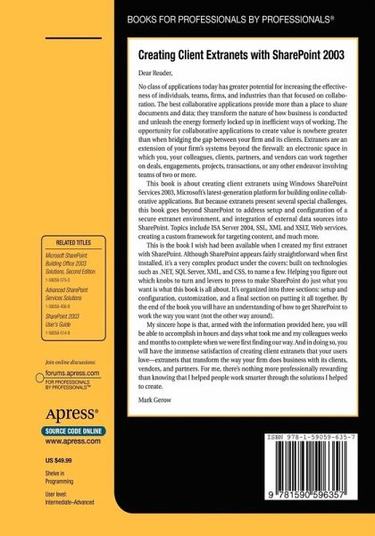 Creating Client Extranets with SharePoint 2003 is a guide for creating client-facing extranets using SharePoint 2003. This book serves as a how-to for building full-featured extranets using SharePoint 2003 and .NET technologies. If you already have experience developing and deploying business applications in .NET, then this book will help you master the intricacies of SharePoint 2003 development and customization.