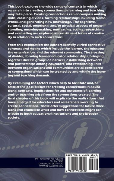 A volume in Research on Teaching and Learning This book explores the wide range of contexts in which research into creating connections in learning and teaching may take place. Creating connections can encompass making links, crossing divides, forming relationships, building frameworks, and generating new knowledge. The cognitive, cultural, social, emotional and/or physical aspects of understanding, meaning-making, motivating, acting, researching, and evaluating are explored as constituent forms of creativity in relation to such connections. From this exploration the authors identify varied connective contexts and means which include the learner, the educator, the organisation, and the relevant community. The crossing of divides, forming learner-educator relationships, bringing together diverse groups of learners, establishing networks and partnerships among educators, and establishing links between organisations and communities are all considered as connections which can be created by and within the learning and teaching dynamic. By examining the factors which help to facilitate and/or restrict the possibilities for creating connections in educational contexts, implications for and outcomes of learning and/or teaching arise from the connections created. The final chapter of this book will explicate the realisations that have emerged for educators and researchers working to create connections. These offer suggestions for future directions and enunciate what and how connections might contribute to both educational institutions and the broader society.