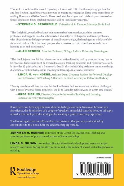 If you have ever been apprehensive about initiating classroom discussion, fearing silences, the domination of a couple of speakers, superficial contributions, or off-topic remarks, this book provides strategies for creating a positive learning experience.Jennifer H. Herman and Linda B. Nilson demonstrate how to create the conditions to facilitate deep and meaningful learning as well as to assess the effectiveness of discussions. They identify, analyze, and solve common problems in both classroom and online discussions and in both small and large classes. They take a direct, practice-oriented approach that--in acknowledging common challenges--provides principles, guidance on design, examples of activities and techniques, and eight detailed case studies. These cases demonstrate successful approaches that faculty across disciplines and from a variety of institutions have adopted in their face-to-face, blended, or online courses at the undergraduate or graduate level. The case authors begin by describing the original pedagogical challenge they faced and explain how they addressed it and assessed the results of their innovation. They also offer practical recommendations to readers who may want to try their strategies. Intended for faculty, this book will be equally valuable for educational developers who can use this resource in their programs and private consultations. At the graduate level, this book can serve as a text or workshop resource in college teaching courses and teaching assistant development programs. The final chapter provides a set of resources and activities - including discussion questions on the case studies, writing prompts, and jigsaw formats - that are equally appropriate for individual study or for use in workshop environments. You'll never again have to suffer such a profound silence that, as described by a contributor to the book, she could hear the crickets chirping outside.