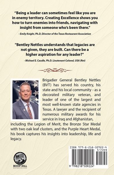 "Bentley Nettles emphasizes the universal importance of selfless service and a commitment to a greater good."Col (R) Russ (doc) Kotwal, 75th Ranger Battalion surgeon and Ranger Hall of Fame inductee "Bentley Nettles takes the experiences from a lifetime of service to his country and community and distills core takeaways for success. His formula for excellence is rooted in practical examples from his true life journey."Karen Bonnarigo, Co-Founder and Winemaker, Messina Hof Winery What every organization wants, and needs, is excellence. Brigadier General Bentley Nettles (BVT) offers insights and battle-tested strategies for creating excellence - for yourself, for your team, and for your company. Inside this book, you will discover: The three-step process for leading others - creating excellence for others inside a simple and easy-to-follow strategy How to build a 90-day plan for creating excellence Self-leadership strategies, so that you can access your values and see situations from other points of view Insights into establishing and maintaining trust How to prepare for the unexpected - and face the unknown with authenticity, collaboration and acceptance From his three decades of service to his country, as a decorated veteran of Iraq and Afghanistan, Nettles shares strategies for negotiation inside of hostile territory - as well as battle-tested leadership strategies. Discover how to walk the talk, drive greater engagement, and listen to people in a new way, on your journey to creating excellence. After his military service, Nettles was appointed to leadership position on the heels of a scandal. He served as the Executive Director of the third-largest state law enforcement agency in Texas (the Texas Alcoholic Beverage Commission, or TABC) for five years, creating transformation around public policy, fighting human trafficking, and helping thousands of small business leaders across the state. Nettles was asked to bring the TABC back to excellence, and he delivered - because of the dedicated team and external resources that supported his vision. Discover how his approach to service created an atmosphere of collaboration and engagement, all around a model for creating excellence. An attorney by training, Nettles served as General Counsel for the Army Element Joint Force Headquarters. He continues to advocate for those in service, particularly in front of the Veterans Administration. A dedicated public servant, Nettles co-founded Brazos Valley Cares, a non-profit group dedicated to serving military veterans and their families. He has served as Chairman of the local energy cooperative, the Bryan Texas Utility Board. From his service to country, state and community, as well as his work as a lawyer and entrepreneur, Nettles has dedicated his life to creating excellence.