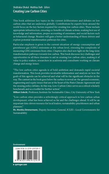"Creating Low Carbon Cities provides a refreshingly critical approach to low-carbon urban development, what has been achieved so far and the challenges ahead. It will be an important data-driven resource for local leaders, sustainability practitioners and urban planners."