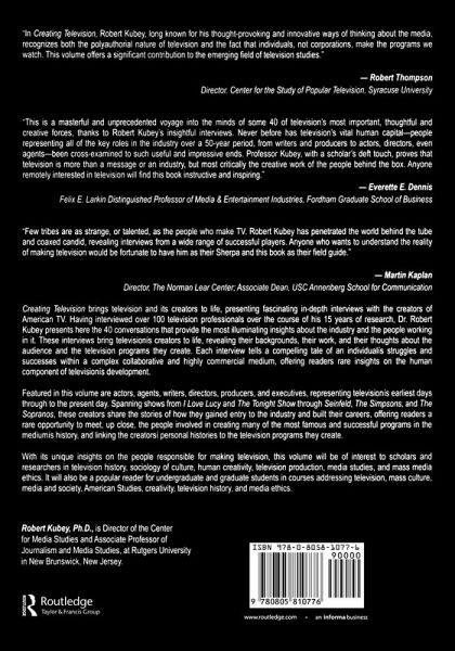 Creating Television brings television and its creators to life, presenting fascinating in-depth interviews with the creators of American TV. Having interviewed more than 100 television professionals over the course of his 15 years of research, Professor Robert Kubey presents here the 40 conversations that provide the most illuminating insights about the industry and the people working in it. These interviews bring television's creators to life, revealing their backgrounds, work, and thoughts about the audience and the television programs they create. Each interview tells a compelling tale of an individual's struggles and successes within a complex collaborative and highly commercial medium, offering readers rare insights on the human component in television's development. Featured in this volume are actors, agents, writers, directors, producers, and executives, representing television's earliest days through to the present day. Spanning shows from I Love Lucy and The Tonight Show through to Seinfeld, The Simpsons, and The Sopranos, these creators share the stories of how they gained entry to the industry and built their careers, offering readers a rare opportunity to meet, up close, the people involved in creating many of the most famous and successful programs in the medium's history, and linking the creators' personal histories to the television programs they create. With its unique insights on the people responsible for making television, this volume will be of interest to scholars and researchers in television history, sociology of culture, human creativity, television production, media studies, and mass media ethics. It will also be a popular reader for undergraduate and graduate students in courses addressing television, mass culture, media and society, American Studies, creativity, television history, and media ethics.