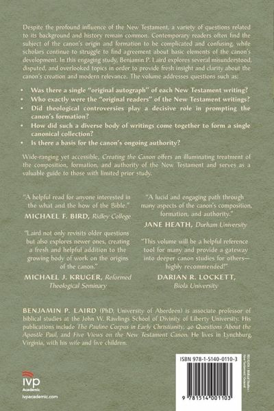 Despite the profound influence of the New Testament, a variety of questions related to its background and history remain common. Contemporary readers often find the subject of the canon's origin and formation to be complicated and confusing, while scholars continue to struggle to find agreement about basic elements of the canon's development. In this engaging study, Benjamin P. Laird explores several misunderstood, disputed, and overlooked topics in order to provide fresh insight and clarity about the canon's creation and modern relevance. The volume addresses questions such as: Was there a single "original autograph" of each New Testament writing? Who exactly were the "original readers" of the New Testament writings? Did theological controversies play a decisive role in prompting the canon's formation? How did such a diverse body of writings come together to form a single canonical collection? Is there a basis for the canon's ongoing authority? Wide-ranging yet accessible, Creating the Canon offers an illuminating treatment of the composition, formation, and authority of the New Testament and serves as a valuable guide to those with limited prior study.