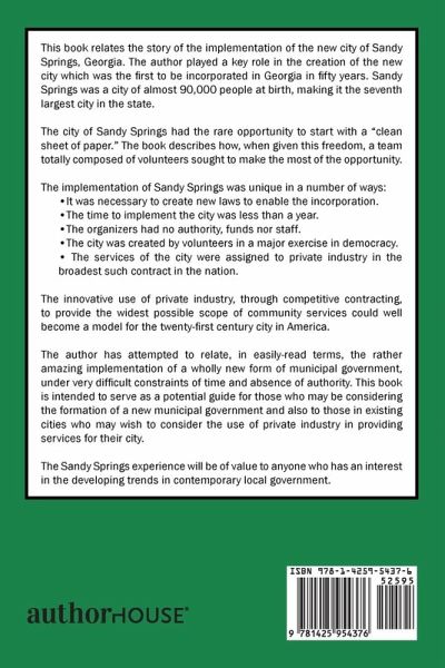 This book relates the story of the implementation of the new city of Sandy Springs, Georgia. The author played a key role in the creation of the new city which was the rst to be incorporated in Georgia in fty years. Sandy Springs was a city of almost 90,000 people at birth, making it the seventh largest city in the state. The city of Sandy Springs had the rare opportunity to start with a "clean sheet of paper." The book describes how, when given this freedom, a team totally composed of volunteers sought to make the most of the opportunity. The implementation of Sandy Springs was unique in a number of ways: ¿It was necessary to create new laws to enable the incorporation. ¿The time to implement the city was less than a year. ¿The organizers had no authority, funds nor staff. ¿The city was created by volunteers in a major exercise in democracy. ¿ The services of the city were assigned to private industry in the broadest such contract in the nation. The innovative use of private industry, through competitive contracting, to provide the widest possible scope of community services could well become a model for the twenty-rst century city in America. The author has attempted to relate, in easily-read terms, the rather amazing implementation of a wholly new form of municipal government, under very difcult constraints of time and absence of authority. This book is intended to serve as a potential guide for those who may be considering the formation of a new municipal government and also to those in existing cities who may wish to consider the use of private industry in providing services for their city. The Sandy Springs experience will be of value to anyone who has an interest in the developing trends in contemporary local government.