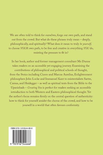 We are often told to think for ourselves, forge our own path, and stand out from the crowd. But what do these phrases truly mean - deeply, philosophically, and spiritually? What does it mean to truly be yourself, to choose YOUR own path, to be free and creative in everything YOU do, resisting the pressure to fit in? In her book, author and former management consultant Ms Dunne takes readers on an accessible yet engaging journey. Examining the contributions of philosophical and political schools of thought, from the Stoics including Cicero and Marcus Aurelius, Enlightenment philosophers John Locke and Immanuel Kant to existentialists Sartre, Camus, and Heidegger - as well as spiritual texts from the Bible to the Upanishads, Creating You is perfect for readers seeking an accessible introduction to both Western and Eastern philosophical thought. Yet the author's focus remains firmly on the central question of authenticity: how to think for yourself amidst the chorus of the crowd, and how to be yourself in a world that often favours conformity.