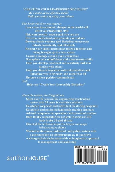 ABOUT THE BOOK As the world changes and the US becomes more competitively challenged by other economies it is easy to see that those who want to fill leadership positions will have to become more skilled and versatile. The US is no longer the automatic leader in many instances and as some would say, "the rising of the rest" provides opportunities and challenges for many, different from those of our traditional leaders. "Creating Your Leadership Discipline" shows how the advantages of those educated in a 'free society' with a higher education system that has a talent meritocracy rather than an exam meritocracy still have an advantage in becoming the leaders the world needs today. The book provides an overview of how the world has changed economically, politically, culturally, and technically. It examines a lot of what has been written on developing leadership qualities and provides an overview of many books pointing out pertinent aspects required for good leadership. It makes the case that learning and understanding one's talents and then developing a discipline to promote and improve those talents will help to create a better leader. The Author's writing style includes enjoyable short stories to help the reader learn about their talents and develop their disciplines. The book also drives home the point that being brought up in a free society really is an advantage in leading others with interpersonal skills and emotional intelligence; qualities necessary for today's leader.