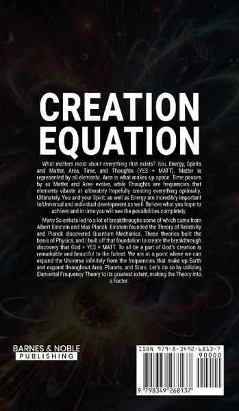 What matters most about everything that exists? Spirit. Matter is created and evolves from spirit, which can be expressed as light. The equation that best demonstrates this is below: E = maTtsc2 = 1 This can be summarized as energy (E), which is equivalent to matter (m), area (a), Time (T), thought (t), spirit (s), and the speed of light (c) squared. This entire equation is equivalent to 1, whether it be 1 atom, 1 being, 1 planet, or even 1 entire Universe. Believing in the spirit and all we are surrounded by enables us to reach the greatest possibilities. Many Scientists led to a lot of breakthroughs some of which came from Albert Einstein and Max Planck. Einstein founded the Theory of Relativity and Planck discovered Quantum Mechanics. These theories built the basis of Physics, and I built off that foundation to create the breakthrough discovery of the 'Creation Equation' listed above. To all be a part of God's creation is remarkable and beautiful to the fullest. We are at a point where we can expand the Universe potentially infinitely from the frequencies that make up Earth and expand throughout Area, Planets, and Stars. Let's do so by utilizing the 'Creation Equation' to its greatest extent, making the Theory into a Factor of the future.