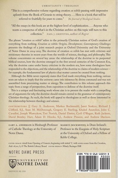 The phrase "creation ex nihilo" refers to the primarily Christian notion of God's creation of everything from nothing. Creation ex nihilo: Origins, Development, Contemporary Challenges presents the findings of a joint research project at Oxford University and the University of Notre Dame in 2014-2015. The doctrine of creation ex nihilo has met with criticism and revisionary theories in recent years from the worlds of science, theology, and philosophy. This volume concentrates on several key areas: the relationship of the doctrine to its purported biblical sources, how the doctrine emerged in the first several centuries of the Common Era, why the doctrine came under heavy criticism in the modern era, how some theologians have responded to the objections, and the relationship of the doctrine to claims of modern science-for example, the fundamental law of physics that matter cannot be created from nothing. Although the Bible never expressly states that God made everything from nothing, various texts are taken to imply that the universe came into existence by divine command and was not assembled from preexisting matter or energy. The contributors to this volume approach this topic from a range of perspectives, from exposition to defense of the doctrine itself. This is a unique and fascinating work whose aim is to present the reader with a compelling set of arguments for why the doctrine should remain central to the grammar of contemporary Christian theology. As such, the book will appeal to theologians as well as those interested in the relationship between theology and science. Contributors: Gary A. Anderson, Markus Bockmuehl, Janet Soskice, Richard J. Clifford, S.J., Sean M. McDonough, Gregory E. Sterling, Khaled Anatolios, John C. Cavadini, Joseph Wawrykow, Tzvi Novick, Daniel Davies, Cyril O'Regan, Ruth Jackson, David Bentley Hart, Adam D. Hincks, S.J., Andrew Pinsent, and Andrew Davison.