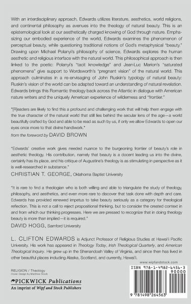 Description: With an interdisciplinary approach, Edwards utilizes literature, aesthetics, world religions, and continental philosophy as avenues into the theology of natural beauty. This is an epistemological look at our aesthetically charged knowing of God through nature. Emphasizing our embodied experience of the world, Edwards examines the phenomenon of perceptual beauty, while questioning traditional notions of God's metaphysical ""beauty."" Drawing upon Michael Polanyi's philosophy of science, Edwards explores the human aesthetic and religious interface with the natural world. This philosophical approach is then linked to the poetic: Polanyi's ""tacit knowledge"" and Jean-Luc Marion's ""saturated phenomena"" give support to Wordsworth's ""pregnant vision"" of the natural world. This approach culminates in a re-envisaging of John Ruskin's typology of natural beauty: Ruskin's vision of the world can be adapted toward an understanding of natural revelation. Edwards brings this Romantic theology back across the Atlantic in dialogue with American nature writers and the uniquely American experience of wilderness and ""frontier.""