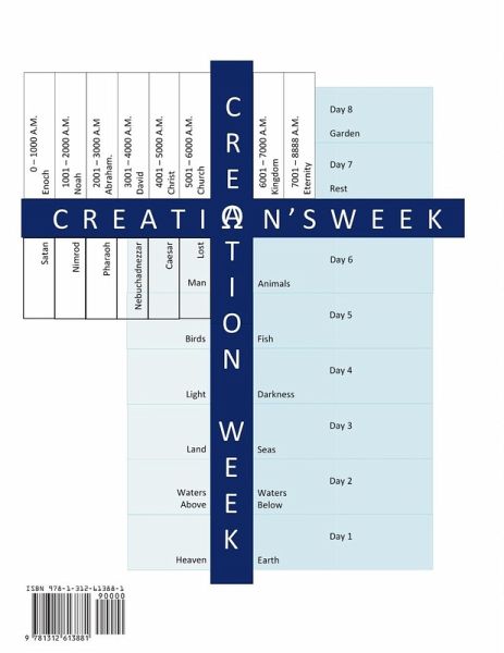 Creation's Week: A Macrocosm of Creation Week God's Creation is one of order and perfection. He created it in a week of days for a week of millennia. As He created two domains: Heaven and Earth, His desire was for both to be populated with a large family which He could love and Fellowship with. Due to freewill and the ability to sin, one domain, the Earth, was created over a time domain, and the other, the Heaven was created commensurate with His Eternal Nature. Since Earth is on a deadline for its week to come to a millennial "weekend" it is time like never before to surrender hearts and lives to God that we might be prepared for the Rapture of The Church, The Millennial Reign of Christ and finally, Eternity. Each day of God's Work of Creation parallels that particular Millennium with the final day fast approaching, the 7th Millennium which is also known as the Millennial Reign of Christ. See new insights on Genesis 1:1-2, the nature of light and darkness, time reconciliation with orbital time from the false notion of atomic time which has been corrected with the recently discovered fact that the speed of light is not an absolute constant, but in fact is actually slowing down and has been since Creation, as well as a never before postulated theory for the location of the Garden of Eden, the Eden River, and the four rivers from Genesis Chapter 2. Enjoy Verse by Verse, teaching commentary with prophetic insights and allusions such as parallels between Creation Week, Holy Week, and The Feast of Booths. And much more . . .