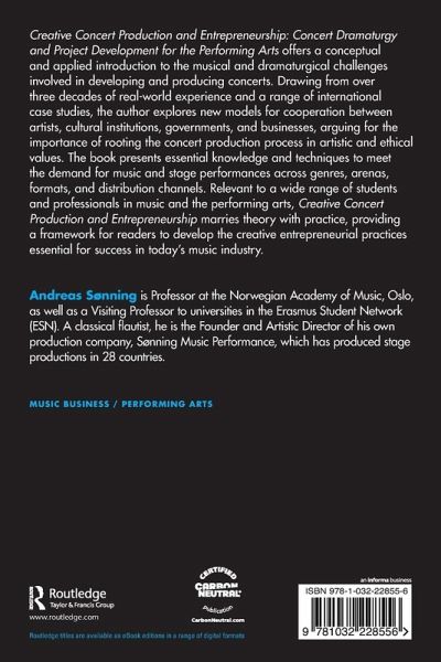 "This book on Concert production and Creative Entrepreneurship is most timely. It comes at a time when the intersection between artistic expression and entrepreneurship presents major opportunities and challenges in practice, theory and research. Professor Andreas Sonning presents a comprehensive, careful, authoritative and thorough treatment of concert production through a cultural entrepreneurship and transdisciplinary lens. The book's strength is in providing a multi actor value chain analysis of the production processes where success is based on the dynamic interaction between the players internally in the value chains and externally in larger value systems, all based on practical experience and examples throughout. This is a must read for students, musicians, professional artists, programme creators, researchers, educators, public and private bodies with an interest in supporting and developing cultural entrepreneurs"
