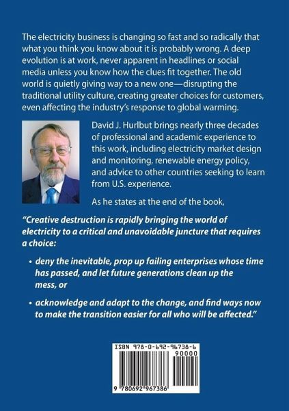 The electricity business is changing so fast and so radically that what you think you know about it is probably wrong. A deep evolution is at work, never apparent in headlines or social media unless you know how the clues fit together. The old world is quietly giving way to a new one-disrupting the traditional utility culture, creating greater choices for customers, even affecting the industry's response to global warming. David J. Hurlbut brings nearly three decades of professional and academic experience to this work, including electricity market design and monitoring, renewable energy policy, and advice to other countries seeking to learn from U.S. experience. As he states at the end of the book, "Creative destruction is rapidly bringing the world of electricity to a critical and unavoidable juncture that requires a choice: deny the inevitable, prop up failing enterprises whose time has passed, and let future generations clean up the mess; or acknowledge and adapt to the change, and find ways now to make the transition easier for all who will be affected."