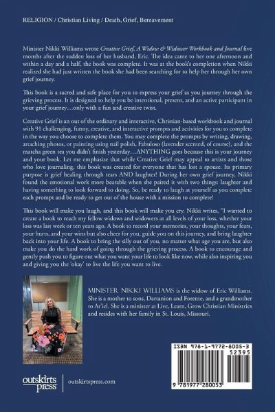 In Creative Grief, A Widow & Widower Workbook and Journal, Author and Minister Nikki Williams has created a sacred and safe place for you to express your grief as you journey through the grieving process...only with a fun and creative twist! This workbook and journal not only challenges you to do the grief work, but it breaks up the hard stuff with hilarious prompts that will have you questioning the author and laughing at yourself. Creative Grief is an out of the ordinary and interactive workbook and journal with 91 challenging, funny, and creative prompts and activities for you to complete in the way you choose to complete them. You may complete the prompts by writing, drawing, attaching photos, creating collages, or painting your response using yesterday's vanilla latte...ANYTHING goes because this is your book, your journey, and your place to let go and allow your grief to create what it will and to just ENJOY yourself! Let me emphasize that while Creative Grief may appeal to artists and those who love journaling, this book was created for EVERYONE who has lost a spouse. Its primary purpose is grief healing through tears AND laughter! During her own grief journey, Nikki found the emotional work more bearable when she paired it with two things: laughter and having something to look forward to doing. So, be ready to cry, laugh, and get out of the house with a mission to complete! This book is: -designed to help you be intentional, present, and an active participant in your grief journey. -to do with as you please because it's your book. All prompts and instructions are open to your own interpretation; you can do as much or as little as you desire. -to bring the silly out of you no matter what age you are but also empower you to do the hard work of going through the grieving process. -for widows and widowers at all levels of your loss. -Christian-based with intentionally placed scriptures at the end of each prompt. -a place to record your memories and stories and to reflect on this journey that comes with losing a spouse. -to encourage and gently push you to figure out what you want your life to look like now, while also inspiring you and giving you the 'okay' to live the life you want to live. "Hi, it's Nikki. I know it's unusual for the author to leave a note, but I wanted to take a moment with you. After the loss of my husband, Eric, I needed a private place to process my grief in its rawest form. As I created this book, I also completed it and discovered that there is beauty in grief. Who knew! I thought the pages of my book would be dreary, reflecting how I thought grief looked; lacking color, inspiration, and life...but I surprisingly found the opposite. I uncovered beauty, inspiration, and life in my prompt responses. The memories, doodles, photos...all of it...blended to create a beautiful story that honored Eric and I's life together. I pray this for you too! I didn't get to this place overnight; it took me a while, but I got here...and so will you!" - Nikki