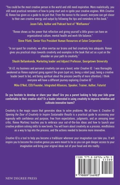 Do you hesitate to develop or share your ideas? Are you a parent looking to help your kids grow comfortable in their creative skin? Or a leader interested in using creativity to improve retention and cultivate innovative teams? Creativity is the magic sauce that generates ideas to solve problems. We all have it. Creative IQ: Opening the Door to Creativity that Inspires Sustainable Results is a practical guide to accessing your ingenuity with confidence and purpose, free from expectations, judgments, and an annoying inner critic. Renee Martinez teaches you to embrace your out-of-the-box ideas and how to launch your creative problem solving skills to new levels. You will learn about creativity as a process, mindfulness as a way to tap into the process, and the actions needed to become more innovative. Creative IQ is a tool to help you become a trailblazer wherever your imagination can take you. It will inspire you to become the creative genius you were meant to be so you can gain deeper access to your imagination and bring your original ideas out of your head and into reality.