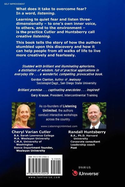What does it take to overcome fear? In a word, listening. Learning to quiet fear and listen three-dimensionally-to one's own inner voice, to others, and to the enviornment-is the practice Cutler and Huntsberry call creative listening. This book tells the story of how the authors stumbled upon this discovery and how it can help people from all walks of life to live more creatively and fearlessly.