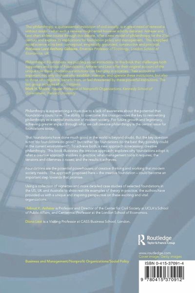 'Philanthropic Foundations are puzzling social institutions. In this book that challenges both supporters and critics of Foundations, Anheier and Leat offer their original account of the unique role these anomalous institutions can best play in societies. Their account is important not only to those who establish, manage, and operate these institutions, but also to those who regulate, benefit from, or feel threatened by these powerful institutions. The last group includes all of us citizens.' - Mark H. Moore, Hauser Professor of Nonprofit Organizations. Kennedy School of Government, Harvard University