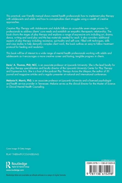 Creative Play Therapy with Adolescents and Adults follows an accessible seven-stage process for professionals to address clients' core needs and establish an empathic therapeutic relationship. The book charts the stages of play therapy and explores a range of expressive arts including art, drama, dance, writing and sand play and the key materials needed for each. It also considers additional aspects of play therapy including resistance, spirituality and self-care. Filled with techniques, skills and case studies to help demystify complex client work, the book outlines an easy-to-follow treatment protocol for healing and resolution.