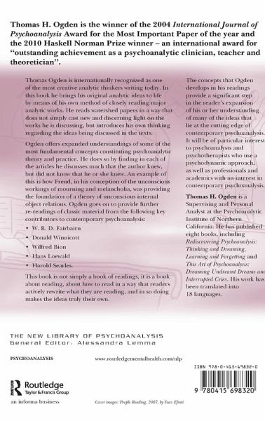 "[Ogden] invites us to pay particular attention to something obvious and that perhaps we all do, consciously or preconsciously when we read any author: that is, to attend carefully to our own reading of the text and the relationship we establish with the work and the ideas it elicits in us as active readers. In this sense, this book is not only interesting, stimulation and enriching for the papers that Ogden has commented on, but also for the invitation he makes to all of us to pay attention to what we do when we read. I do recommend it highly." - Carlos Fishman, Psychoanalytic Psychotherapy, September 2013