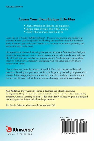 Create Your Own Unique Life-Plan Practise freedom of thought and expression Regain peace of mind, love of life, and joy Clarify what you want your life to be Learn the art of Creative Self-Development-free your imagination and realise your potential. Create your own journal by following the steps laid out in this interactive guide. Keeping a personal journal enables you to explore your creative potential, and exploration leads to discovery. Living creatively starts with knowing that you are important. Your task is to find your special gift, your passion, your joy above the rest, and to make that the centre of your life. This will bring you satisfaction, purpose and joy. You, being your true self, help others to be themselves. Because you recognise your own value, you won't have to compete with others. Now is when you create the tapestry of your life. Do it with passion and love and intention. Knowing how your mind works is the beginning...knowing the power of the Creative Mind brings you peace, love and joy. Be afraid of nothing-you have within you all you will need-all wisdom, all power, all strength and all understanding.