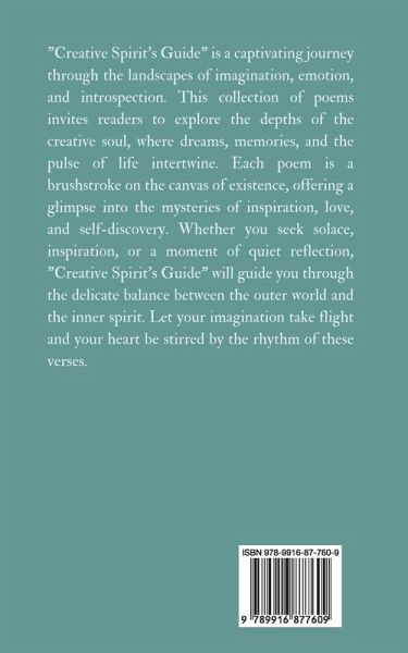 "Creative Spirit's Guide" is a captivating journey through the landscapes of imagination, emotion, and introspection. This collection of poems invites readers to explore the depths of the creative soul, where dreams, memories, and the pulse of life intertwine. Each poem is a brushstroke on the canvas of existence, offering a glimpse into the mysteries of inspiration, love, and self-discovery. Whether you seek solace, inspiration, or a moment of quiet reflection, "Creative Spirit's Guide" will guide you through the delicate balance between the outer world and the inner spirit. Let your imagination take flight and your heart be stirred by the rhythm of these verses. Copyright © 2024 Book Fairy Publishing