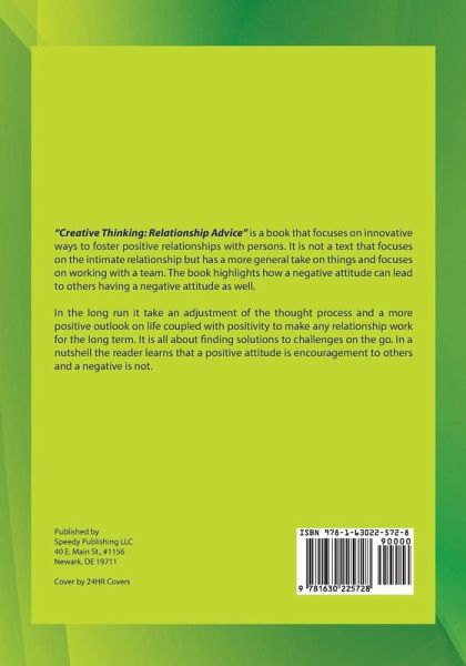 "Creative Thinking: Relationship Advice" is a book that focuses on innovative ways to foster positive relationships with persons. It is not a text that focuses on the intimate relationship but has a more general take on things and focuses on working with a team. The book highlights how a negative attitude can lead to others having a negative attitude as well. In the long run it take an adjustment of the thought process and a more positive outlook on life coupled with positivity to make any relationship work for the long term. It is all about finding solutions to challenges on the go. In a nutshell the reader learns that a positive attitude is encouragement to others and a negative is not.