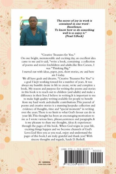 Creative Treasures For You" is written to impart knowledge and produce some enjoyable poems and stories on cultural facts, traditional & inspirational ideas, self-esteem & family issues, career choices, honesty, and ideas on simply doing positive things in life. All the poems and stories are original writings. Another purpose of this book is to reach out to children and adults and make a difference in their lives. The inspirational and motivational material written in this book, focuses on inspiring phrases and sentences, notable quotes, childhood memories & traditions, Bahamian and Personal poems, Tributes, writing prompts and more... After being introduced to this book, the reader will be equipped to explore other reading material and activities to enhance his/her reading skills and creative writing styles.