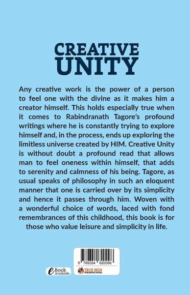 Any creative work is the power of a person to feel one with the divine as it makes him a creator himself. This holds especially true when it comes to Rabindranath Tagore's profound writings where he is constantly trying to explore himself and, in the process, ends up exploring the limitless universe created by HIM. Creative Unity is without doubt a profound read that allows man to feel oneness within himself, that adds to serenity and calmness of his being. Tagore, as usual speaks of philosophy in such an eloquent manner that one is carried over by its simplicity and hence it passes through him. Woven with a wonderful choice of words, laced with fond remembrances of this childhood, this book is for those who value leisure and simplicity in life.