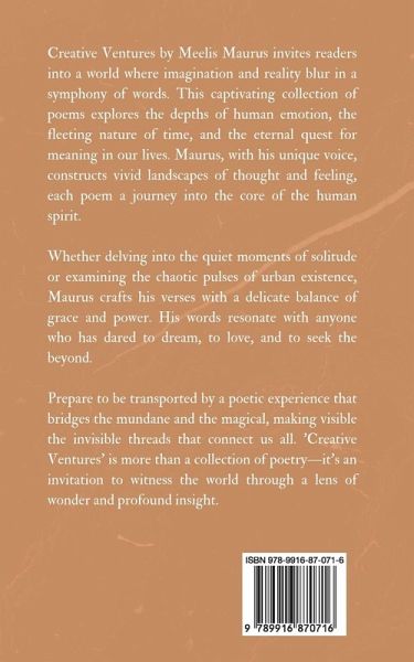 Creative Ventures by Meelis Maurus invites readers into a world where imagination and reality blur in a symphony of words. This captivating collection of poems explores the depths of human emotion, the fleeting nature of time, and the eternal quest for meaning in our lives. Maurus, with his unique voice, constructs vivid landscapes of thought and feeling, each poem a journey into the core of the human spirit. Whether delving into the quiet moments of solitude or examining the chaotic pulses of urban existence, Maurus crafts his verses with a delicate balance of grace and power. His words resonate with anyone who has dared to dream, to love, and to seek the beyond. Prepare to be transported by a poetic experience that bridges the mundane and the magical, making visible the invisible threads that connect us all. 'Creative Ventures' is more than a collection of poetry-it's an invitation to witness the world through a lens of wonder and profound insight. Copyright © 2024 Book Fairy Publishing