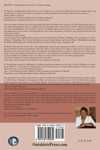The development of worship and arts ministry requires valuable input and insight from Church leaders and Academy scholars. With Creative Worship in a Contemporary Milieu, the Church and Academy intersect as Dr. Lisa Weah offers scholarly insights grounded in her experience as the former Minister of Cultural Arts and Worship at a burgeoning urban church in the heart of Baltimore, MD. This book provides meaningful tools for incorporating creative arts into corporate worship. -Reverend Nolan Williams, Jr. Chief Music Editor, African American Heritage Hymnal