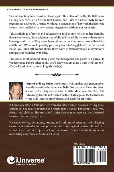 Jeanne Sandberg Fuller has done it once again. The author of The Day the Bathroom Ceiling Fell, Nice Girls Are the Best Kissers, and Tales of a Closet Belly Dancer presents her new book, Creative Writhing, a compilation of her work that has won awards, been published in newspapers, magazines and those not yet in print. This anthology of stories and adventures is told as only she can in her friendly, down-home voice. Each selection is carefully and cheerfully written with exquisite language and charm. They range from sailing on the new power boat with hubby and the kids (What could possibly go…mehr