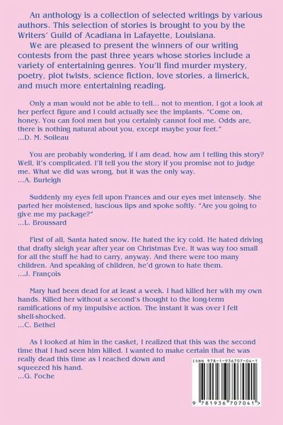 An anthology is a collection of selected writings by various authors. This selection of stories is brought to you by the Writers' Guild of Acadiana in Lafayette, Louisiana. We are pleased to present the winners of our writing contests from the past three years whose stories include a variety of entertaining genres. You'll find murder mystery, poetry, plot twists, science fiction, love stories, a limerick, and much more entertaining reading. One afternoon I decided to surprise Richard with a visit. I quietly knocked on his door and received no answer to enter, so I walked in. To my surprise and horror, Richard's creamy behind was doing the mamba with an unknown female. ...D. M. Soileau You are probably wondering, if I am dead, how am I telling this story? Well, it's complicated. I'll tell you the story if you promise not to judge me. What we did was wrong, but it was the only way. ...A. Burleigh Suddenly my eyes fell upon Frances and our eyes met intensely. She parted her moistened, luscious lips and spoke softly. "Are you going to give me my package?" ...L. Broussard First of all, Santa hated snow. He hated the icy cold. He hated driving that drafty sleigh year after year on Christmas Eve. It was way too small for all the stuff he had to carry, anyway. And there were too many children. And speaking of children, he'd grown to hate them. ...J. François Mary had been dead for at least a week. I had killed her with my own hands. Killed her without a second's thought to the long-term ramifications of my impulsive action. The instant it was over I felt shell-shocked. ...C. Bethel As I looked at him in the casket, I realized that this was the second time that I had seen him killed. I wanted to make certain that he was really dead this time as I reached down and squeezed his hand. ...G. Foche